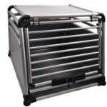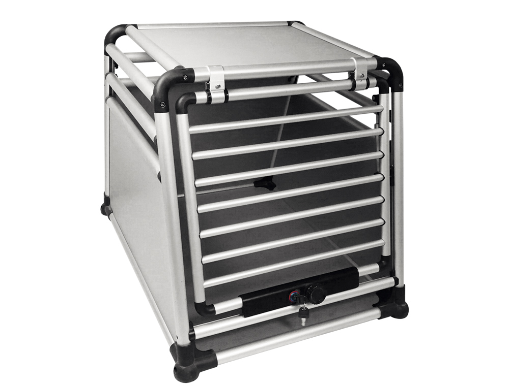 Aluminium hundebur med runde hjørner i forskellige størrelser. Den er særligt stabil, sikker og støjsvag, og døren åbner opad med en luftpudepiston og en låsbar drejelås. Den har en skrå front og bagside for optimal udnyttelse af bagagerummet, og de afrundede hjørner beskytter bilens interiør.