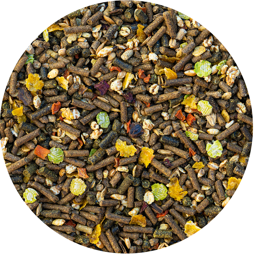| Composition | Timote græs, Avner af hørfrø, Havreklid,Rapsskrå, Majsmask, Poppet byg, byg, majs, Hestebønneskaller, Isomalt, Rapsolie, Hvedeklid, Ærteflager, Sojabønner(non GMO), Spelt, Johannesbrød, Gulerodsflager, Hørfrø, Rødbedeflager, Ærter, Cikorie |