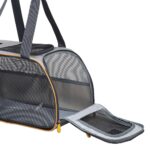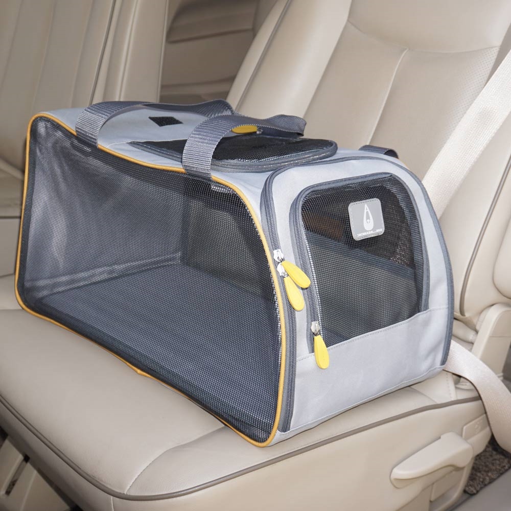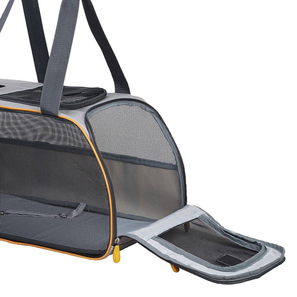Slidstærkt mikrofiber, vaskbart; til katte og små hunde op til 6 kg; polstret, formbevarende taske; god ventilation gennem fire forskellige åbninger; front- og topåbning kan åbnes helt og fastgøres; med 2 utensilrum; løkker til fastgørelse