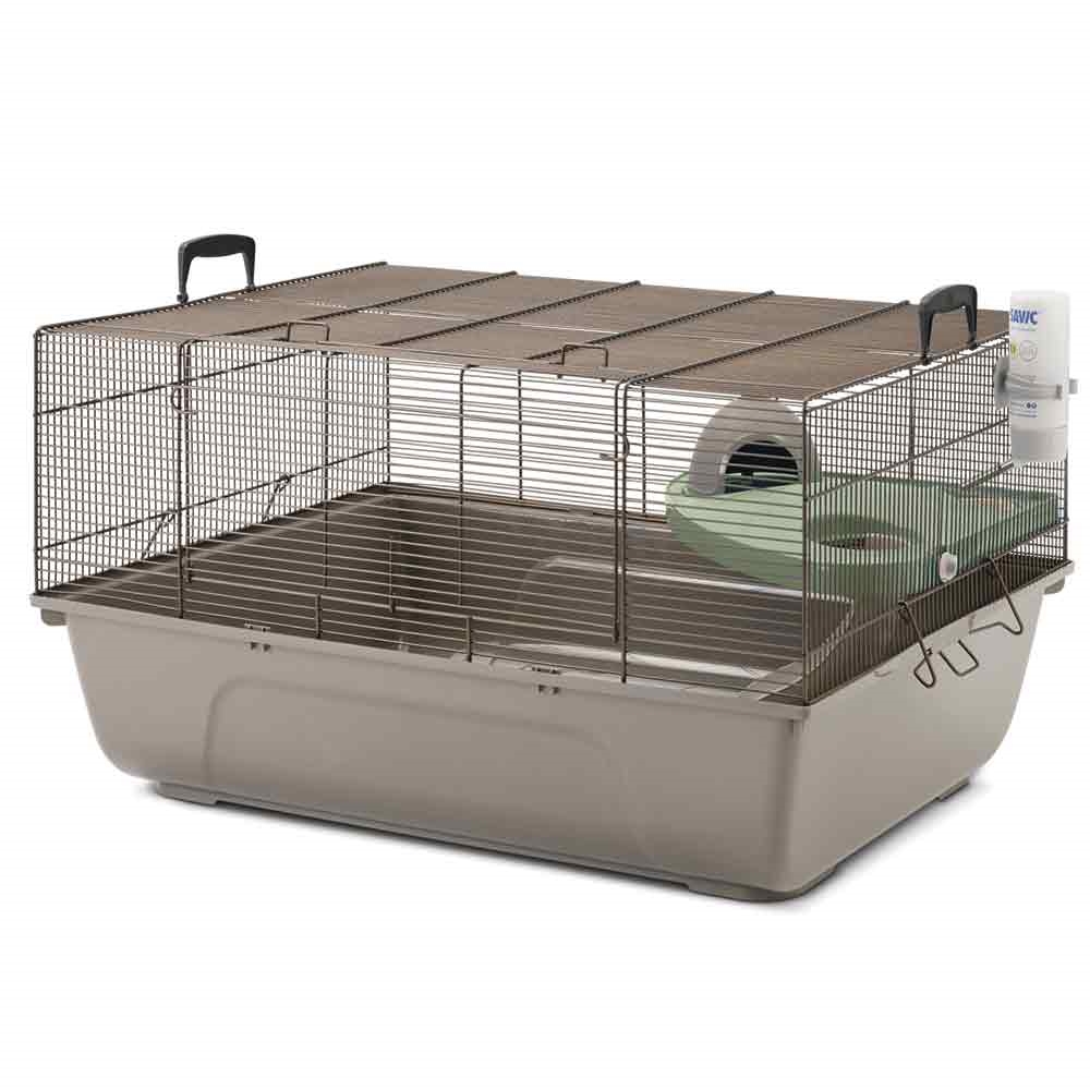 [0] => Stabilt mus og dværghamster hjem; med ekstra stor frontklap; plastbakke; brunlakeret metalnet; speciel trådbehandling; inkl. tilbehør; trådafstand 6,5 mm; størrelse 67 x 49 x 36,5 cm