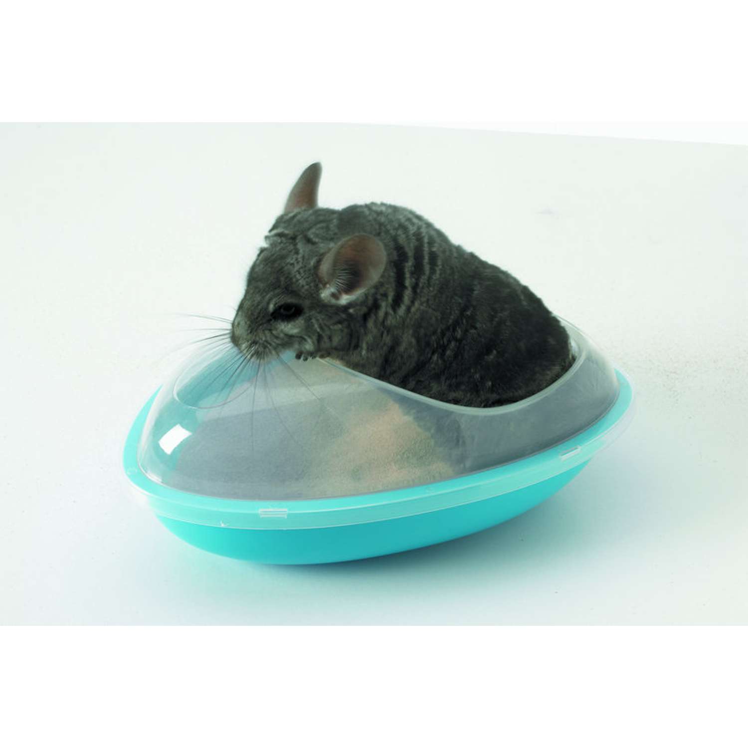 [description] => Chinchillabad i blåt og transparent plastik, måler 26 x 23 x 15 cm.