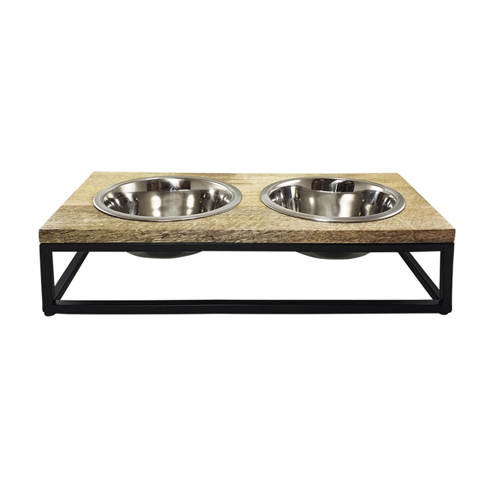 [description] => Med mangotræ og robust metalramme; inkl. 2 aftagelige skåle i rustfrit stål; sikker stand takket være skridsikre fødder