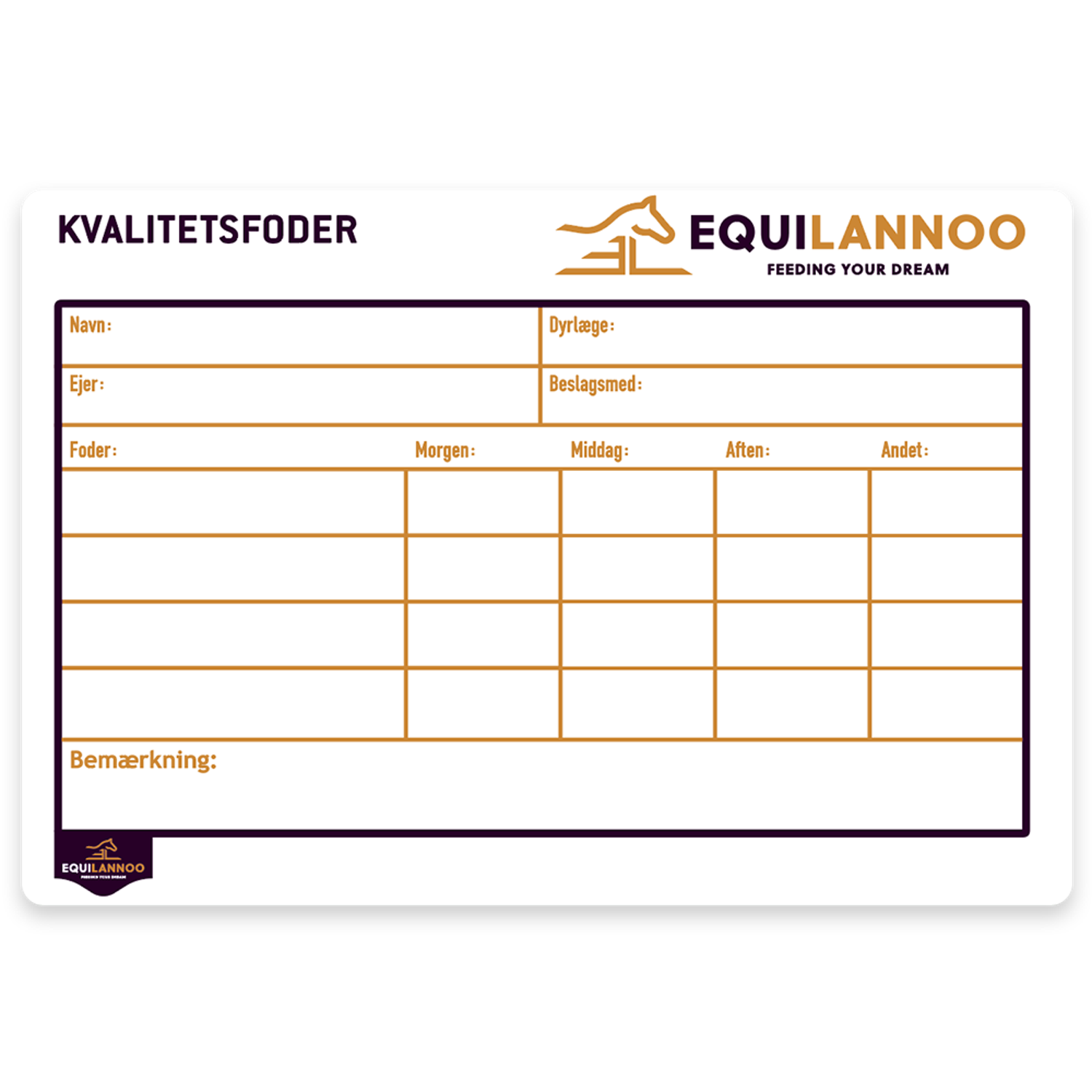 Indeholder plads til både ejer, dyrlæge og smeds oplysninger samt plads til hestens foderplan.