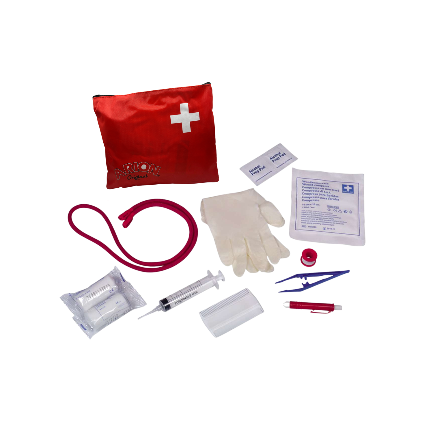 Førstehjælps-kit til hunde, inklusiv en mundkurv, doseringssprøjte, steril sårkompress, sterile bandager, tape, alkoholservietter, flåttang, pincet, engangshandsker og loppe- og lusekam. Praktisk taske med lynlås og velcro-lukning, som kan fastgøres.