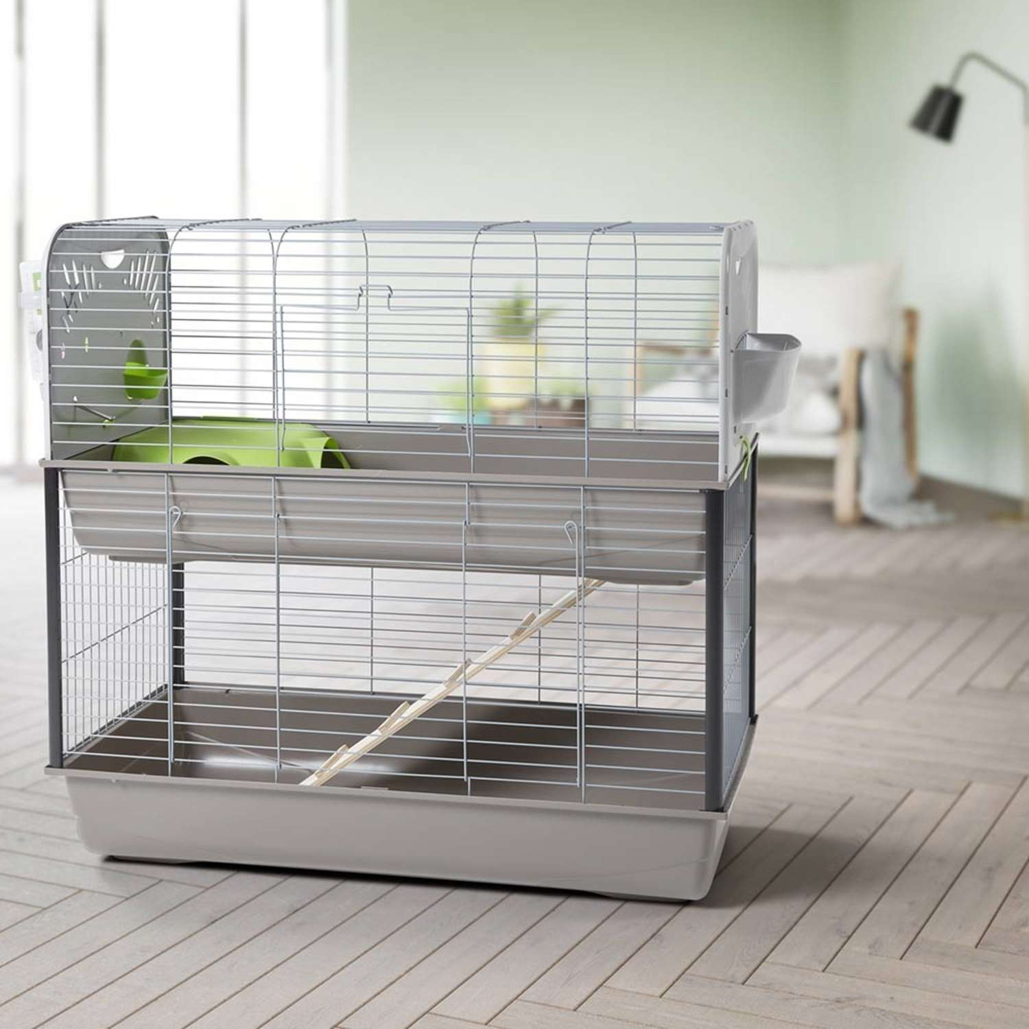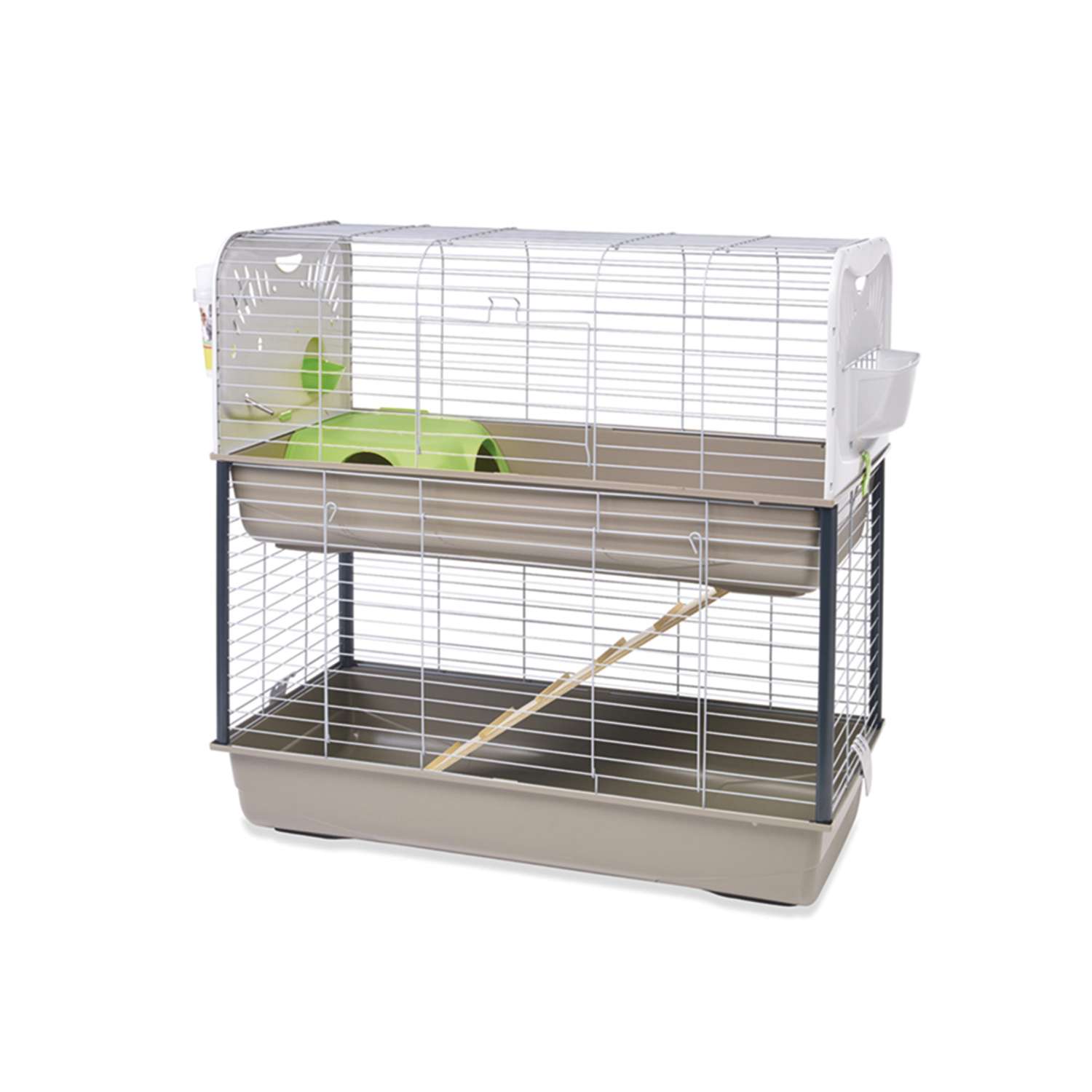 2-etagers lille dyrebur; øverste etage med 2 store døre; nederste etage med 1 stor fordør; inkl. udstyr