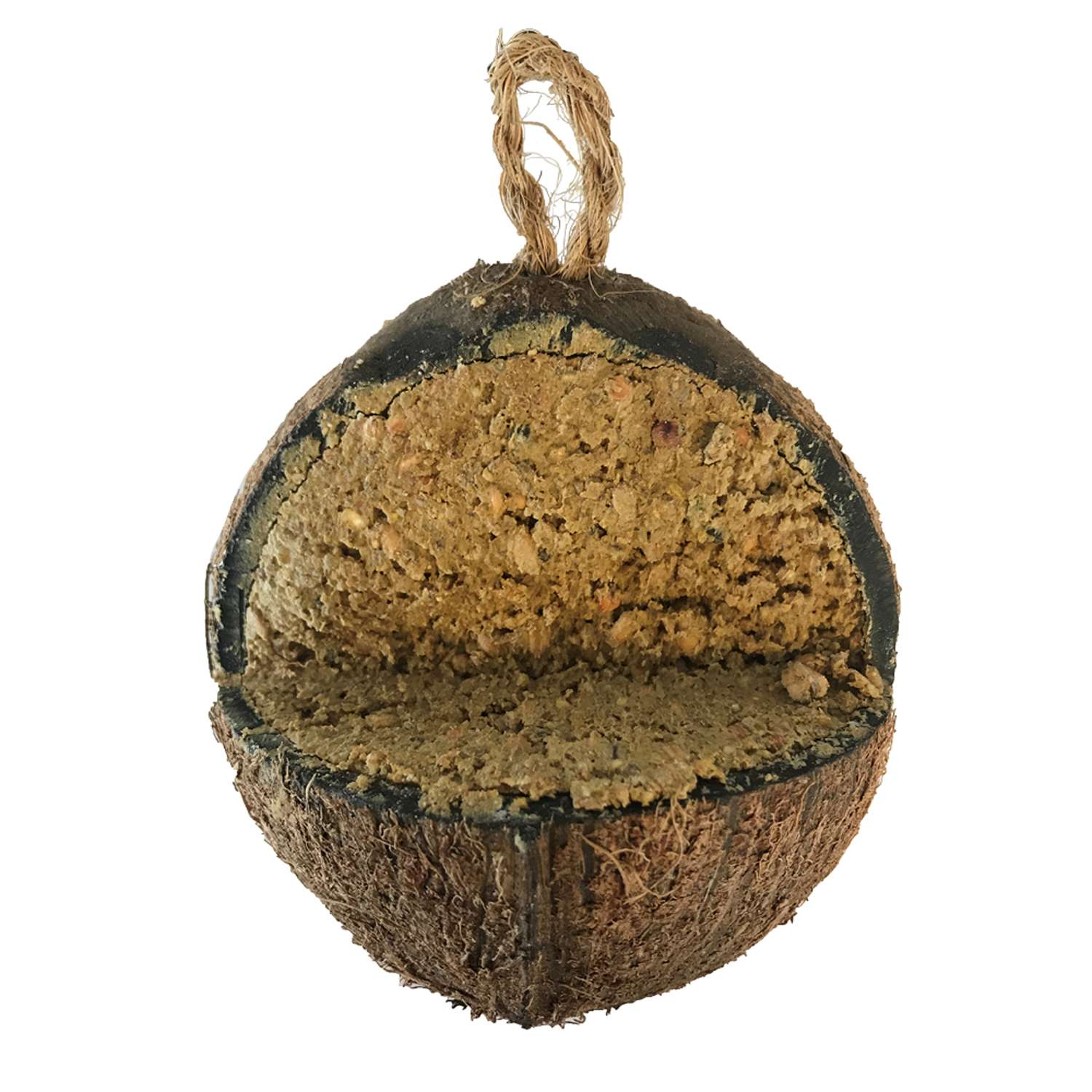 Hel kokosnød fyldt med fedt og frø. Kokosnødden er forsynet med ophæng og kan hænges overalt i haven. Er stadig dekorativ efter at fuglene har spist fedtet, men kan også genfyldes af ”rest fedt” fra madlavningen.