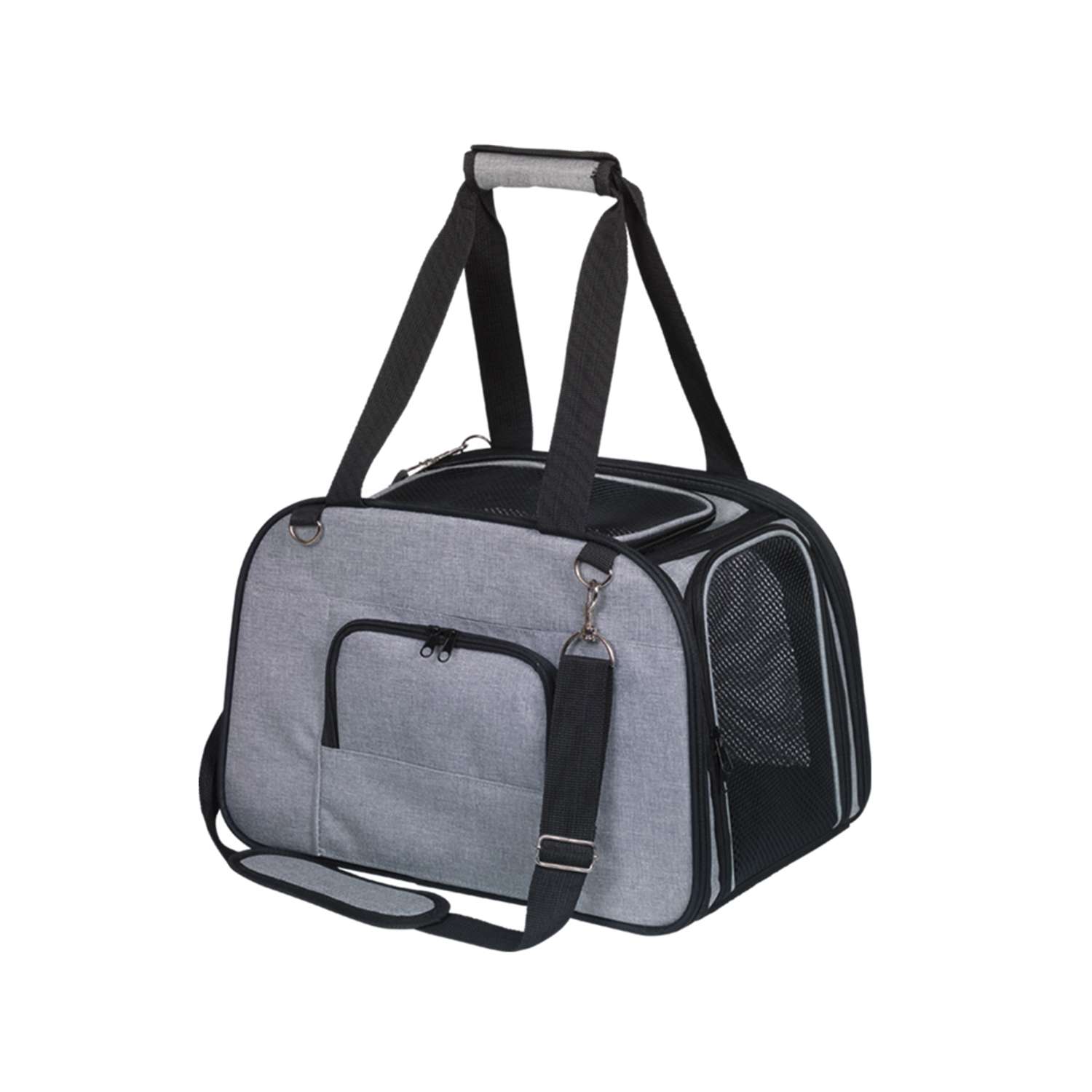 Taske i grå farve med målene 43 x 28 x 28 cm, velegnet til katte og små hunde op til 7 kg. Tasken er lavet af slidstærkt mikrofiber og kan vaskes. Den har fire mesh-vinduer for god ventilation, en aftagelig bund med en side i blød plys og en aftagelig cover. Tasken har en skulderrem og håndtag, samt en karabinhage indvendigt.