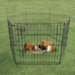 Hvalpegård med 6 elementer på 60x60cm med en dør. Nem at samle og kan bruges både indendørs og udendørs.