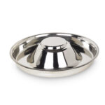 Rustfri stål hvalpefoderskål med bred fodringsspalte og medium højde, ideel til fælles hvalpefodring.