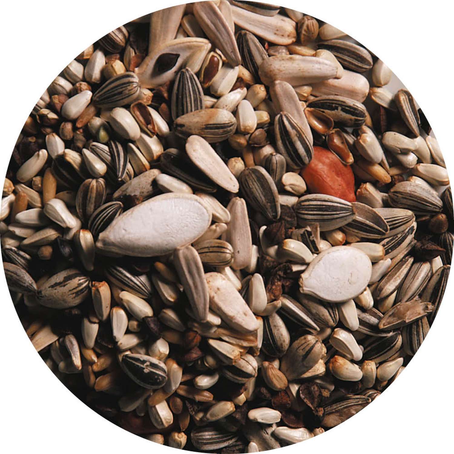 Kardi, afskallet havre, boghvede, solsikke, hamp, jordnødder, hvid solsikke, græskarkerner.