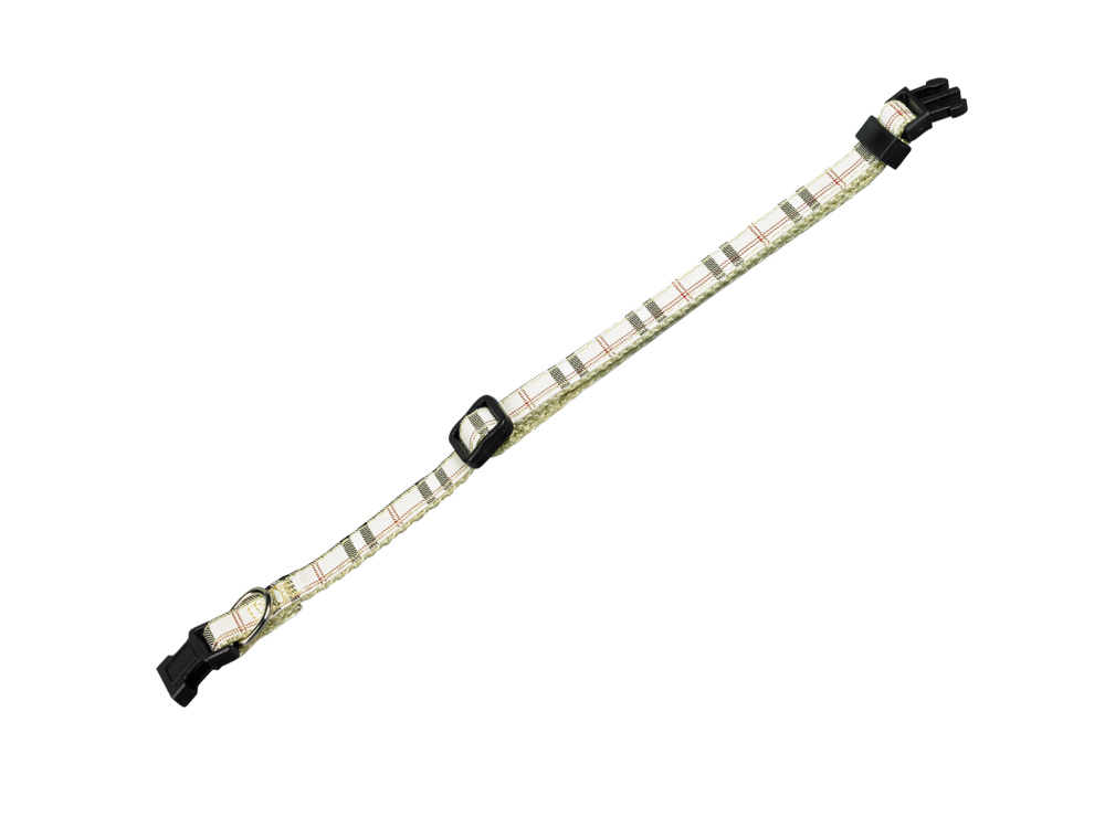 Kattehalsbånd i beige tartan mønster, justerbart og med sikkerhedslås og klokke for at sikre din kats sikkerhed. Lavet af nylon og plastik.
