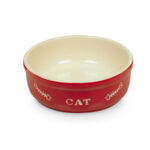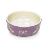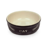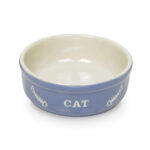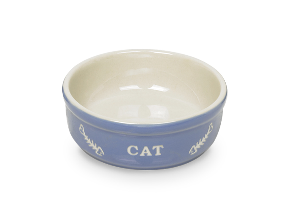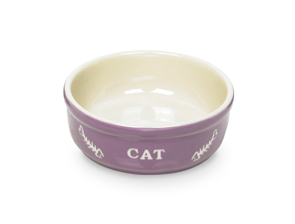 Keramisk katte-skål i forskellige farvekombinationer med en kapacitet på 0,25 liter og en diameter på 13,5 cm og en højde på 5 cm. Designet med korte bogstaver “Cat” og en fiskeben-print, som henvender sig til katte-ejere.