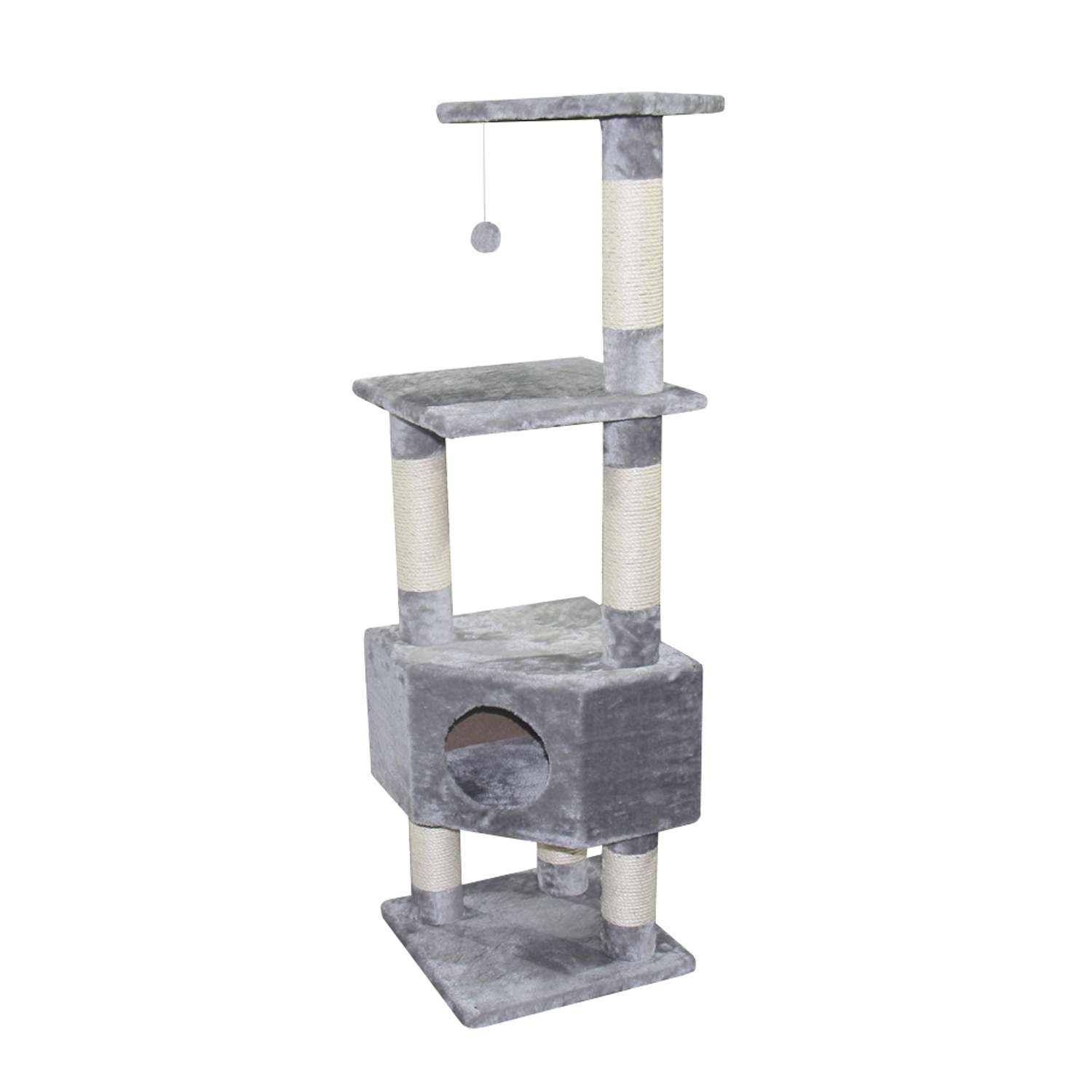 [0] => Kradsetræ "ETSCH" i grå farve med en base på 40 x 40 cm og en højde på 136 cm. Udstyret med Ø 9 cm sisalstammer, en hule, en legetøj og nogle liggepladser. Designet er med grå plys.
