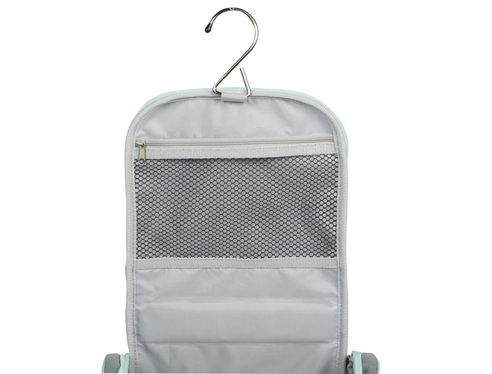 Mikrofiber, vaskbar; to store opbevaringsrum og lille netlomme; krog til ophængning og håndtag