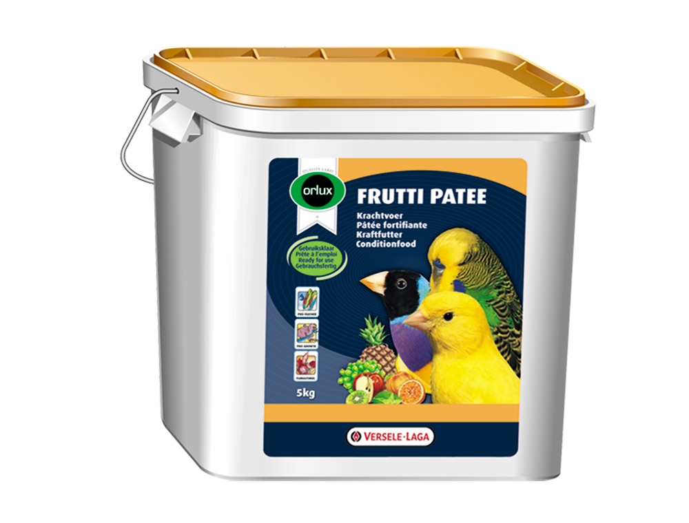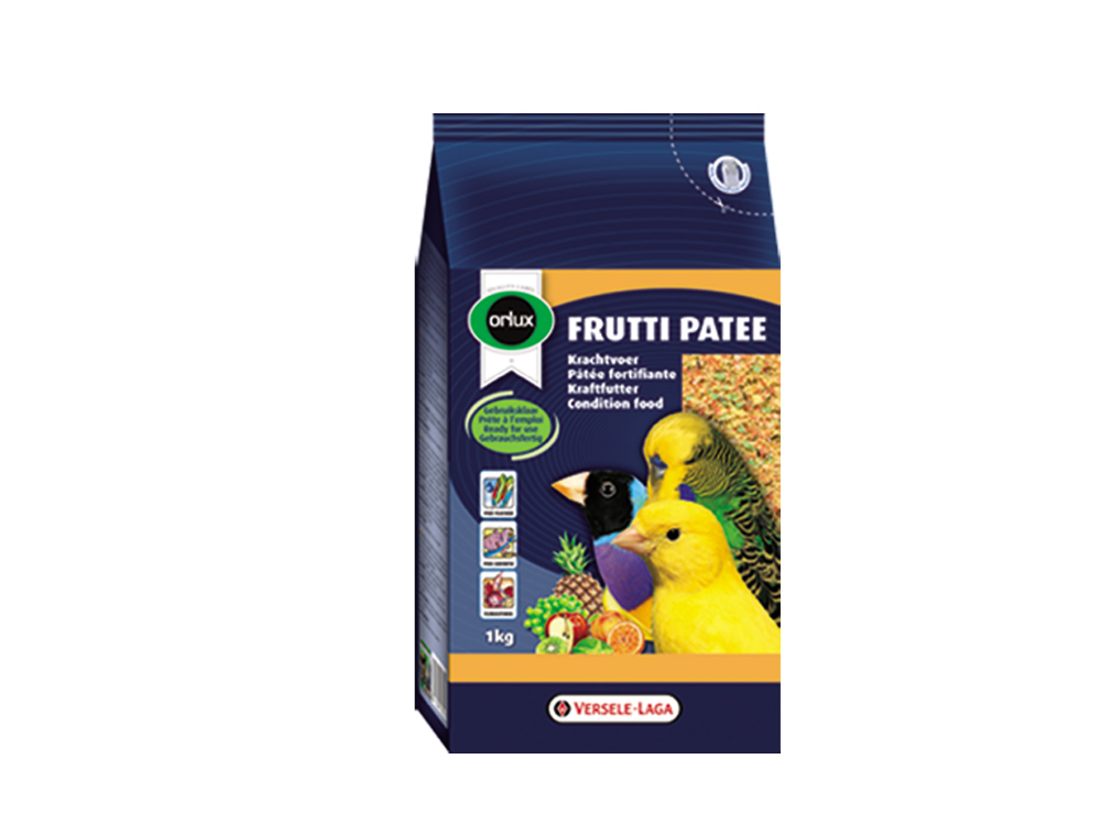 Orlux Frutti patee er en farverig konditionsføde med tørret frugt til kanariefugle, tropiske finker og små parakitter. Den er også en populær godbid for kæledyrsfugle. Frutti patee er beriget med tørret frugt og har en høj næringsværdi takket være tilsætning af 100% ren og naturlig honning. Den ekstra tilsatte lysin og methionin garanterer optimal vækst og fjer-komposition.