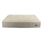 Beige, mikrofiber i linnedlook og blød plys; bund: 4 cm vaddfleece, 4 cm memory-skum, 8 cm komfortskum; aftageligt betræk med lynlås; skridsikker.