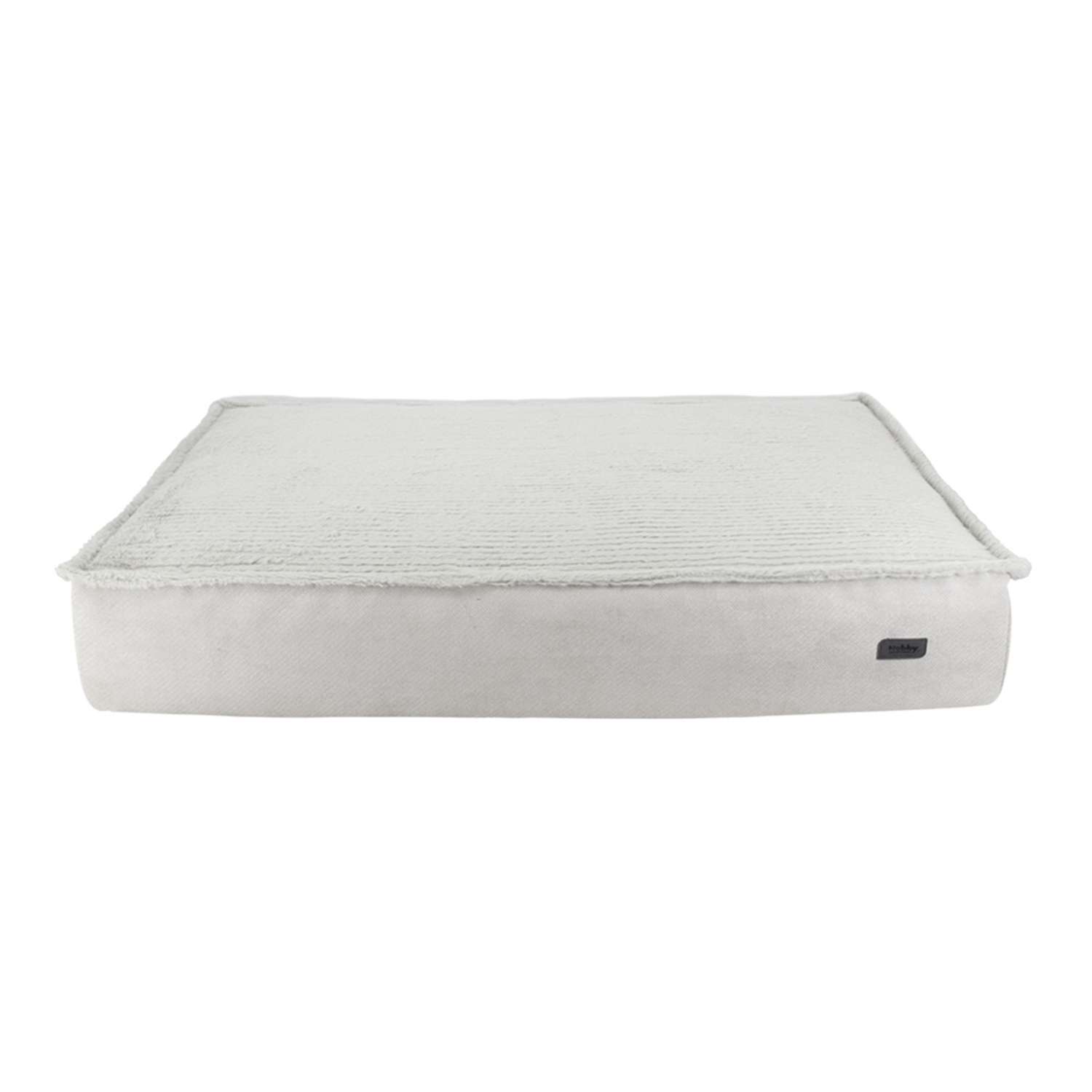 Lys grå, mikrofiber i linnedlook og blød plys; bund: 4 cm vaddfleece, 4 cm memory-skum, 8 cm komfortskum; aftageligt betræk med lynlås; skridsikker.
