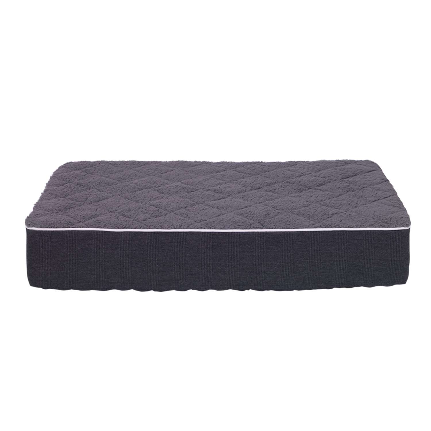 Mørkegrå; mikrofiber i linned look og blødt plys; bund: 4 cm memory-skum, 12 cm komfortskum; betræk aftageligt med lynlås; skridsikker; kun håndvask ved 30°C