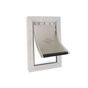 PetSafe aluminium kattelåge i forskellige med to-vejs-lås og ekstra metal sikkerhedslåge. Fleksibel og transparent klap, der passer til katte eller små hunde. Kan monteres i træ eller væg.