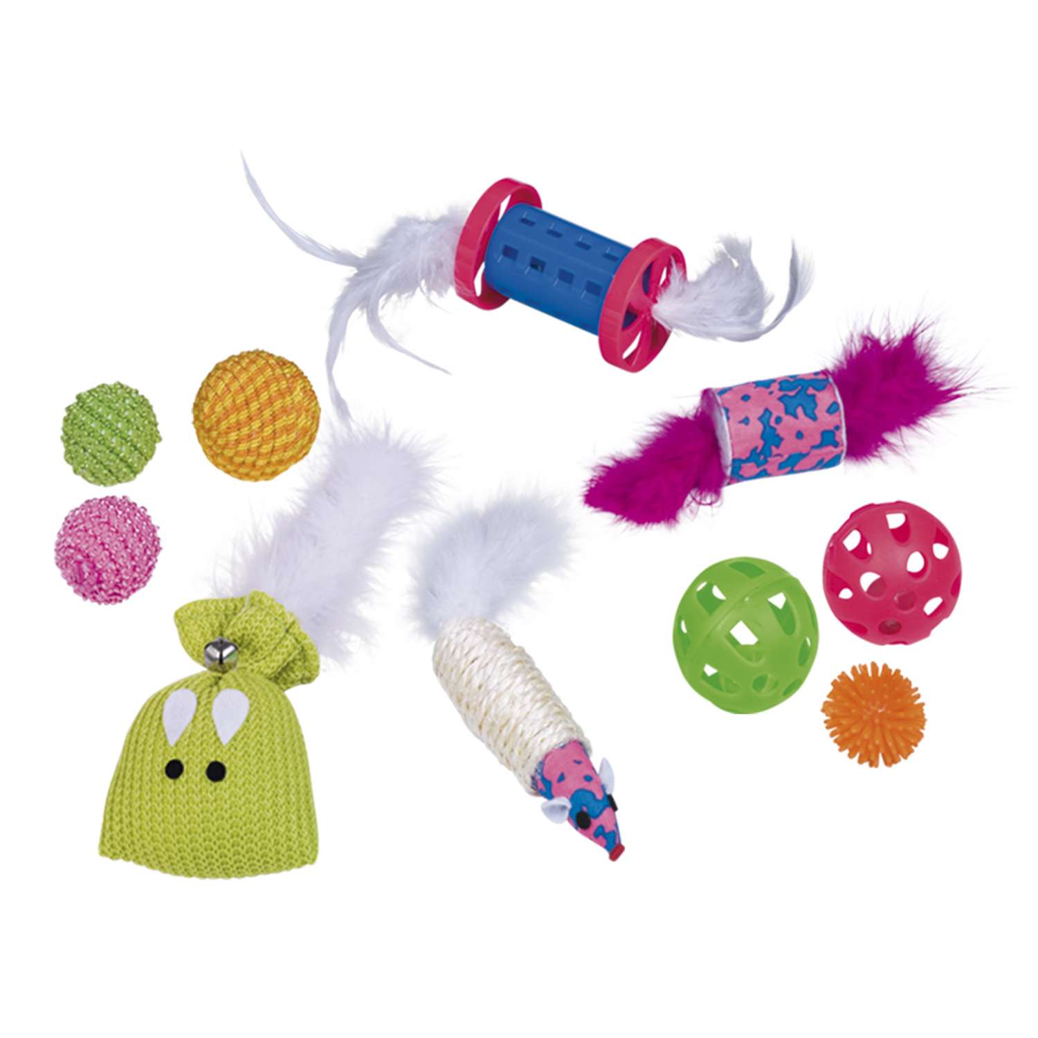 10-stykker legetøj til killinger; Alle legetøj med klokke eller rasle undtagen pindsvinebold; farver og placering kan ændre sig