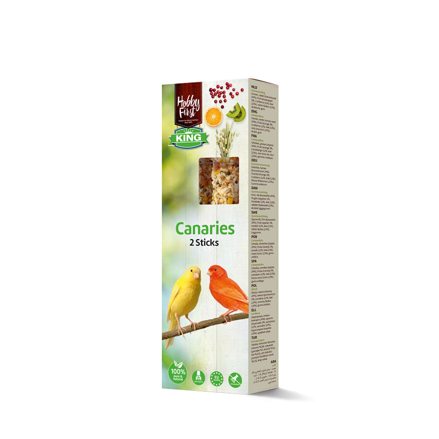 | Composition | Korn, frø (kanariefrø 24%), frugter (appelsin 3%, tranebær 3,2%, kiwi 2,5%), nødder (kokosnød 2,5%), arabergummi |