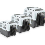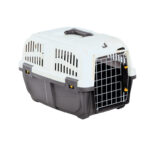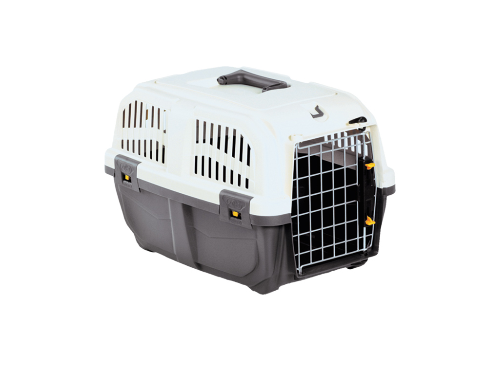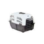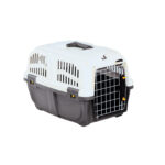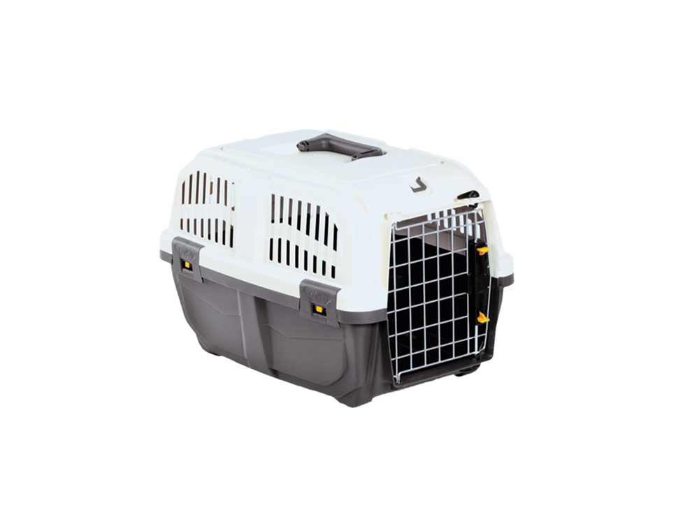 Transportkasse “Skudo” i grå farve. Fås i forskellige størrelser og er egnet til hunde og katte. Godkendt til flyrejser og accepteret af de fleste flyselskaber (kontakt flyselskabet for at bekræfte). Udstyret med låsbare spænder og en metal dør med sikkerhedslås. Praktiske opbevaringsrum til dokumenter og tilbehør.
